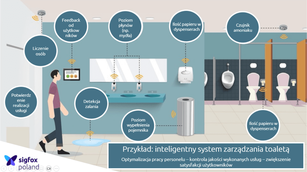 Instalacja czujników Internetu Rzeczy umożliwia optymalizację procesów związanych z utrzymywaniem czystości w toaletach i reagowaniem na nieprawidłowości. Urządzenia mogą śledzić poziom zanieczyszczenia powietrza, liczbę osób w toalecie i przeciętny czas oczekiwania na wolną kabinę. Nie brakuje również automatyzacji wykrywania zalania podłogi czy stanu papieru toaletowego, mydła, koszy czy ręczników papierowych. Dodatkową zaletą rozwiązania jest autonomiczność sieci IoT, która uniezależnia działanie systemu od dostawców zewnętrznych oraz długie życie baterii, które zapewnia stabilność funkcjonowania urządzeń.